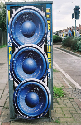 O2 speaker postersThese 02 speaker posters advertising a new mp3 download facility really caught my eye as they make a junction box look like a speaker cabinet. It's a classic case of advertisers jumping on the graffiti band wagon.All photographs copyright artofthestate 2004 |