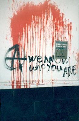 Anti Barclays Graffiti, New MaldenSometimes all you need is a splash of colour and an old fashioned paint brush to get your message across. All photographs copyright artofthestate 2004 |
