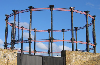 Gas Tower, Kings Cross, LondonPart of a rapidly dying breed of gas cylinder towers, this ine near Kings Cross includes some intricate iron work.