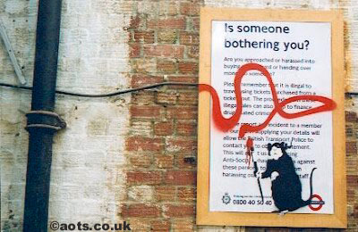 Banksy Rat on the UndergroundThis rat appears on a Underground poster warning people not to sell on their travelcards to touts on the underground.