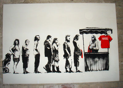 Banksy Barely Legal LA show Destroy Capitalism canvasThe T shirt that everyone in this picture is queuing up to buy reads Destroy Capitalism. It's been a good earner over the years. all LA Photos courtesy of Moff ©2006