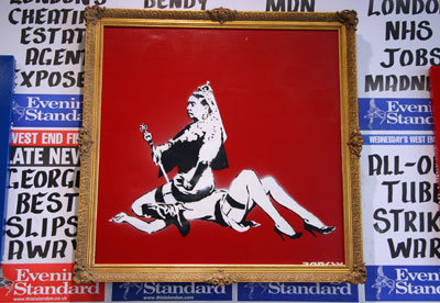 Banksy Queen Victoria Canvas, POW exhibition London '06Part of a POW exhibition near Green Park, London in May 2006. Queen Victoria famously refused to pass a law outlawing lesbianism as she refused to believe such things existed.... Photo İartofthestate.co.uk 2011