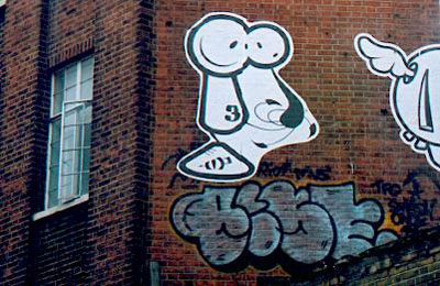 The London police 'Lads' and D-Face posterHigh up on a wall in Old Street. The London Police (now based in Amsterdam) must have had some fun pasting this up. And yeah, if you are wondering, it was a joint hit with D-face - see the balloon dog figure on the right. All photographs copyright artofthestate 2003 |