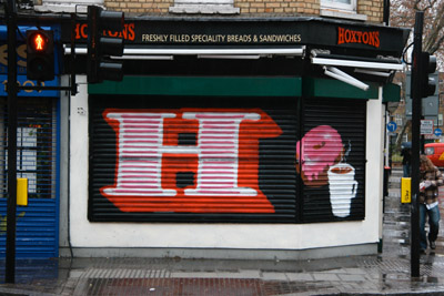 Eine graffiti, Old Street.Another letter H in Old Street, near the White Cube. All photographs copyright artofthestate 2005 |