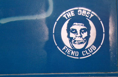 Obey Fiend Club stencilMuch imitated, the Obey stencil is one of the most successful non marketing campaigns ever. So successful in fact in has now turned as a recognisable brand in such things as Black Eyed Peas single videos. All photographs copyright artofthestate 2004 |
