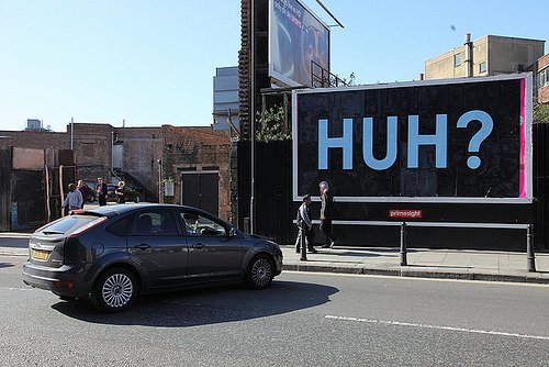 Mobstr’s text images are starting to appear all over the East End of London including his most common which is quite simply “Huh”?