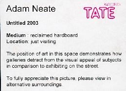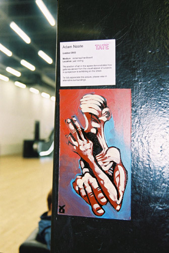 | OK, time to put on a show. I fix up the painting with a fake explanation and sit back to watch the results. I was originally more concerned with security chucking me out for putting the picture up. As people have a look I suddenly realise taking it down is going to look even more suspicious to the gallery viewers. So to the bemusement of some German tourists I finally walk up, take the painting down and put it backing my bag and head upstairs to take a picture with St Paul's in the background. Just as I'm putting it up the gallery alarm bells sound throughout the building. It's probably nothing to do with me that the entire Tate is being cleared (I guess it's some bored school party setting off the fire alarm) but I decide to cut my losses and leave the building in the crowd. |