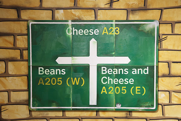 Heading up on the escalator you arrive on the first floor and the main exhibition space. There’s a replica of the side of a London Underground carriage along with many other real items from the network – lighting, CCTV, cabling, fencing – it’s all here. Each artist has his own section for their particular style of off street work – from road signs, to moquette patterns, to detailed paintings with lots of cameos. There’s also a special place reserved for the memory of Robbo (RIP), with personal items, photos and a clear love of Arsenal Football Club.