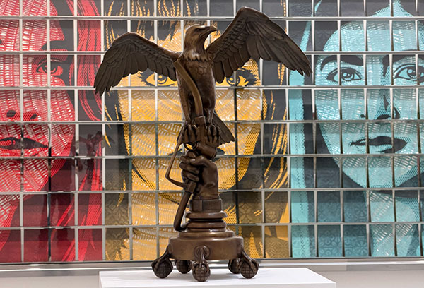 Shepard Fairey – ‘Operation Oil Freedom’, bronze, edition of 5. In the background is Shepard Fairey, Damien Hirst ‘Dissection Under a Microscope’