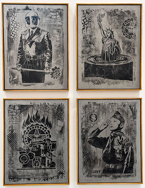 Shepard Fairey (clockwise). 1. My Florist is a Dick, 2. Sinking Liberty, 3. Printing Press, 4. Learn to OBEY. Mono-engraving on aluminum