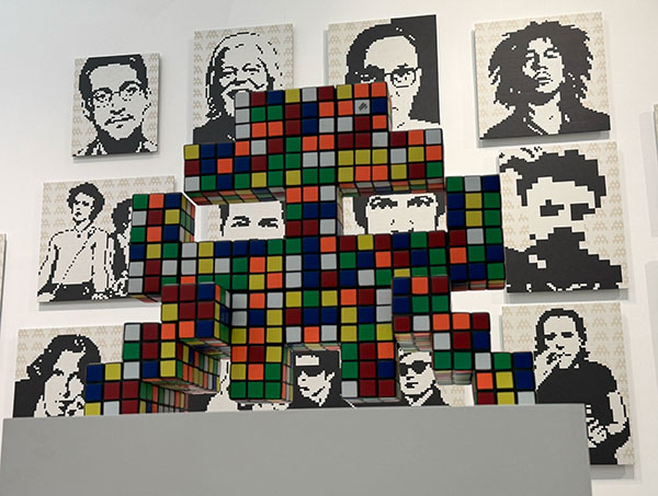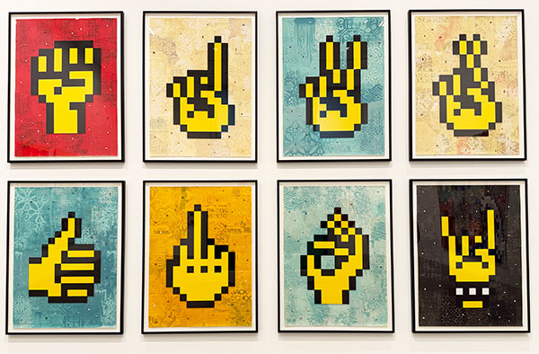 Shepard Fairey, Damien Hirst, Invader – all PVC tiles and pills on painted paper.