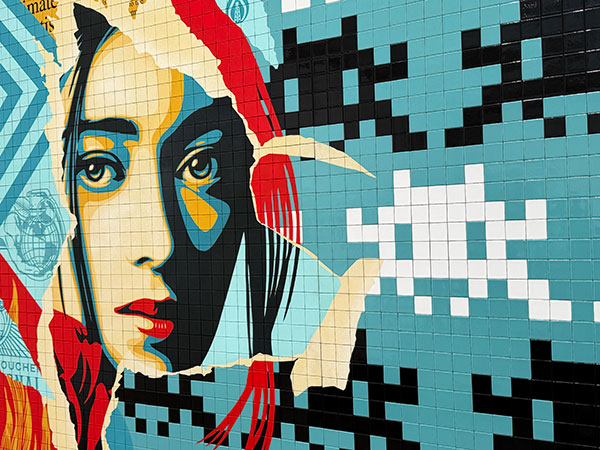 Detail from Shepard Fairey, Invader ‘Planetary Threat’. Mixed media and ceramic tiles on MDF
