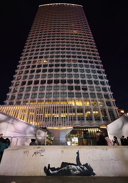 They first appeared on the morning of Saturday 20th December. First to be found was the as yet unclaimed work at the foot of the Centre Point Tower. It’s on street defences designed not to be moved – or slept upon, with their angled tops and studs every few feet. The location of this piece cannot be a coincidence. In 1969 Centre Point stood empty, owned by property speculators while at its base were young rough sleepers. A local Reverend set up a shelter for them in the Soho area and called the charity Centrepoint. This charity has expanded over the years and now offers support to over 15000 young people every year. Centre Point itself was occupied by housing campaigners in 1974 in protest, an event which gained widespread media coverage at the time.
