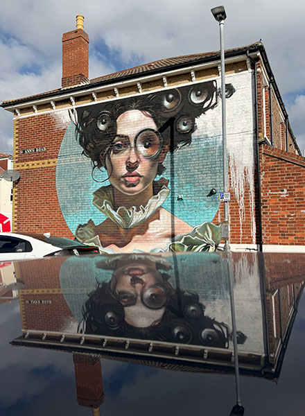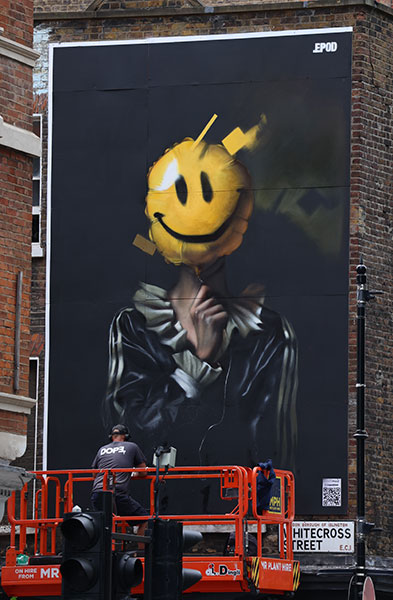 Epod at Ashridge HouseEpod3000 wal at Yardworks, GlasgowEpod3000 on Whitecross Streetepod3000 working on his mural at the Northern entrance to Whitecross StreetWork in progress, Epod in Southsea as part of the Looking Up festivalFinished EPOD artwork as part of Lookup PortsmouthEpod in Whitecross StreetEpod – Create (Shoreditch)EPOD art in PortsmouthEpod street art on the Holiday Inn Express in CheltenhamEpod street art in Cheltenham Epod at work during the Whitecross Street Party (2025)